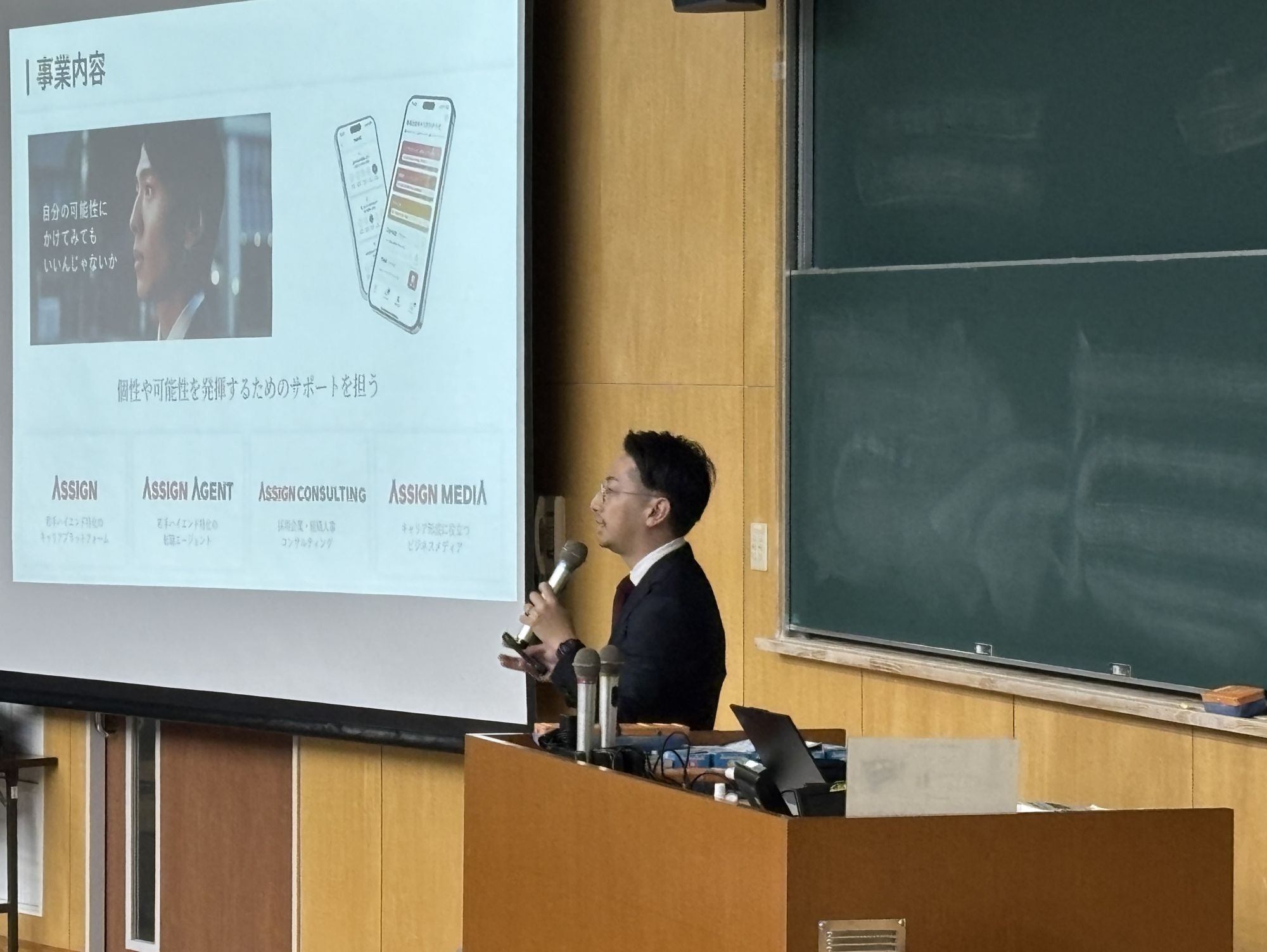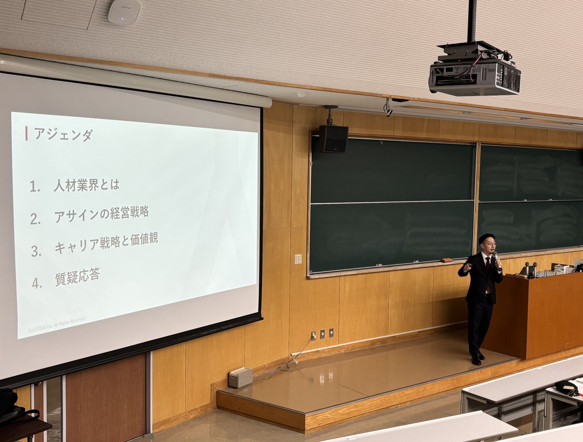 大阪大学大学院経済学研究科が開講する講義「ビジネスモデル研究」に外部講師として登壇いたしました 。当日は、弊社キャリアプラットフォーム事業部長の福田が講師を務め 、成長を続ける人材業界の構造と、アサインが掲げる独自の経営戦略について100名を超える学生に向けて講義を行いました。